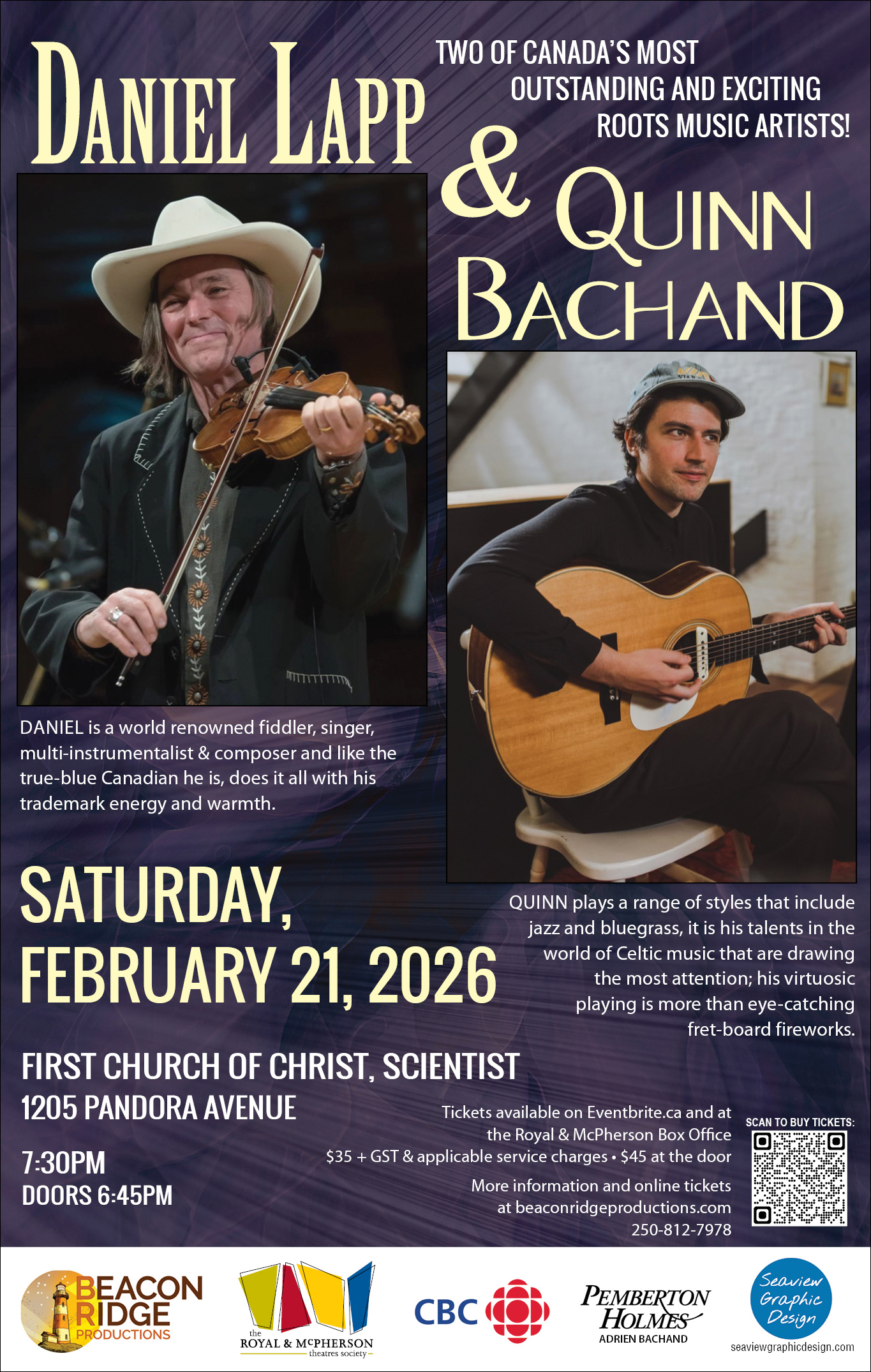 Two of Canada’s most outstanding and exciting roots music artists! This is a concert you won’t want to miss! Daniel Lapp is a world-renowned singer, multi-instrumentalist, composer, teacher, archivist, band leader, sideman, producer, promoter and – no kidding – the list goes on. And like the true-blue Canadian he is, Daniel does it all with trademark energy and warmth. As a fiddler, jazz trumpeter and singer/songwriter, Daniel Lapp has played on over 100 albums and performed across Canada, United States, Ireland, England, Scotland, Wales, Finland and Germany with some of the world’s most renowned Folk and Jazz musicians. Daniel is the winner of the B.C. Fiddle Championship and has appeared as a soloist with the CBC Chamber Orchestra as well as the Prince George, Victoria, and Vancouver Symphonies. A legendary force in Canada’s fiddle scene, in addition to his outstanding performing, Daniel has been musical mentor to hundreds of students—many of whom have gone on to successful careers in the music industry.