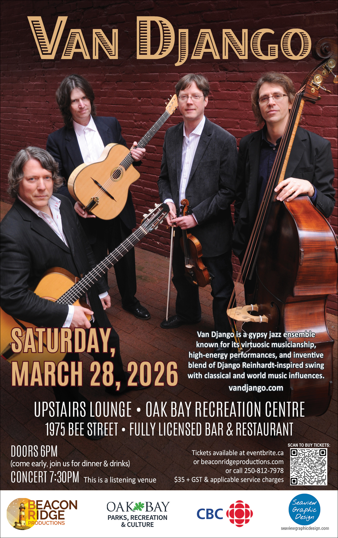 Van Django’s music is well-rooted in the gypsy jazz of 1930’s Paris France, but beyond that it’s all pure blue-skying; flights of dazzling fancy, driving rhythms and boundless creativity featuring original compositions and arrangements including humorous mash-ups that showcase their eclectic influences in full regalia.