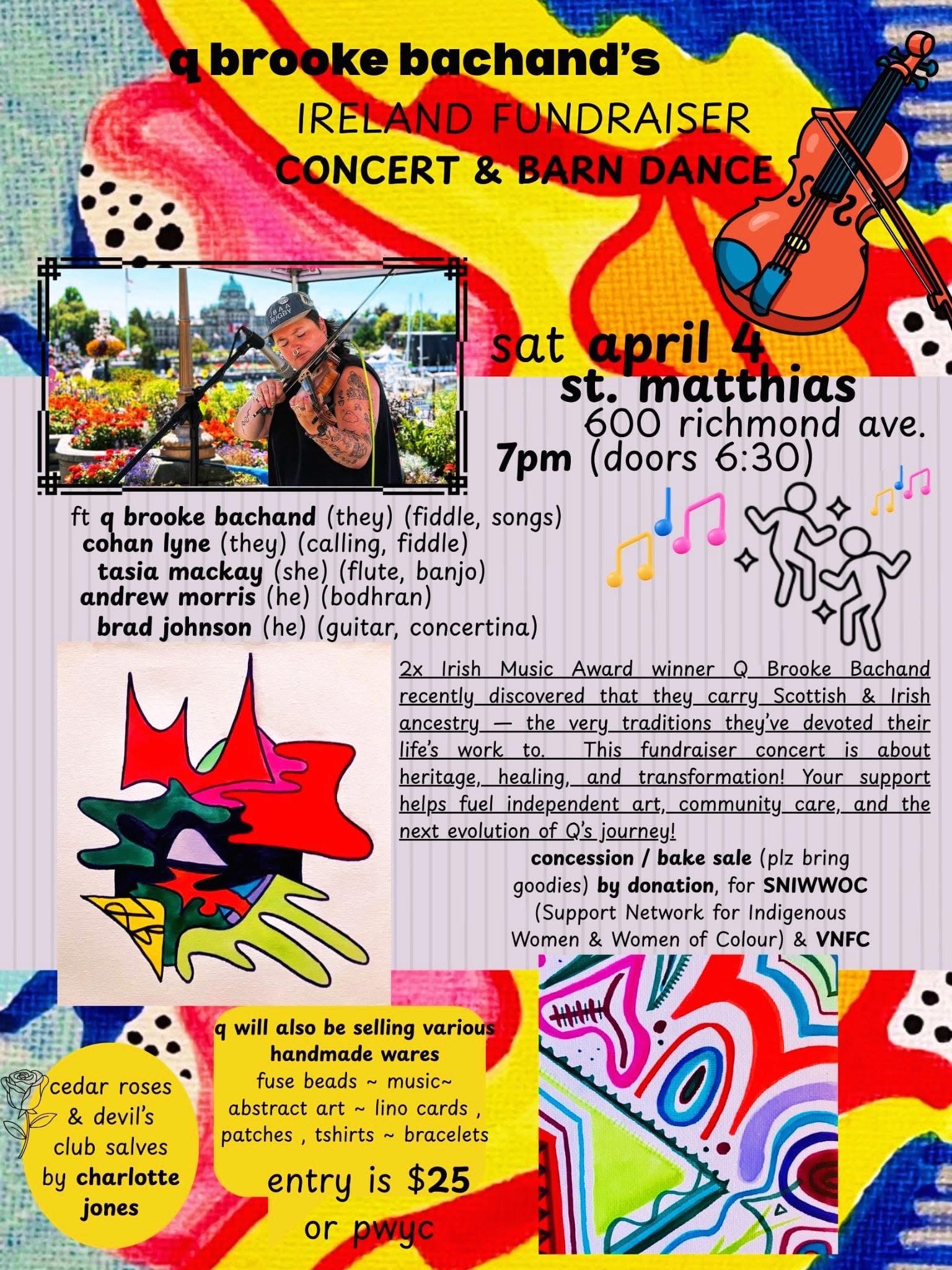 We hope you’ll join us for a wonderful evening of music and dance! The evening will start with a short concert featuring Q Brooke Bachand who will be presenting repertoire from their upcoming album “Seeds of Discontent”. Non-binary west-coast artist ‘Q’ , has been celebrated in the Canadian and International Celtic music scene as one half of the award-winning powerhouse duo Qristina & Quinn Bachand. Recognized for their powerful fiddle, captivating vocals and infectious energy, their love of Folk and Celtic music has always been at the forefront as they captivate audiences with spirited performances that showcase their fiddle & vocal talents, along with their passion for folk songs and storytelling.